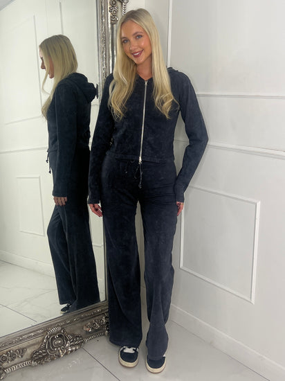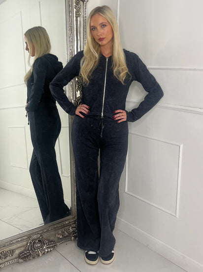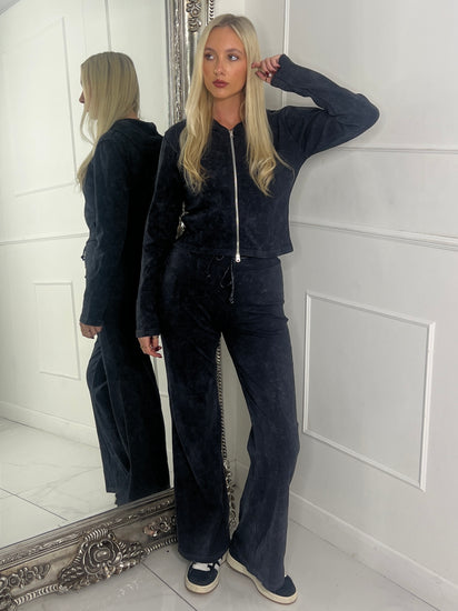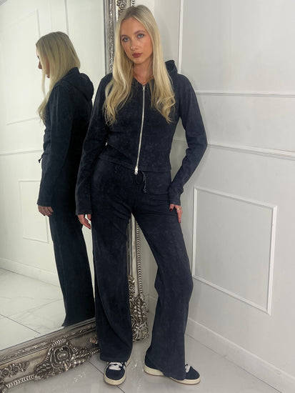 Acid wash ribbed zip front jacket & Flares Set - Black Acid Wash