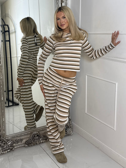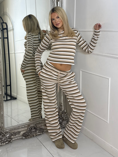 Collar Detail Striped Long Sleeve Top & Wide Leg Pants Co-Ord - Beige Multi