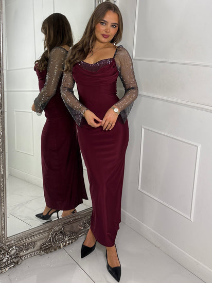 Cowl neck Chainmail Contrast maxi Dress - Wine