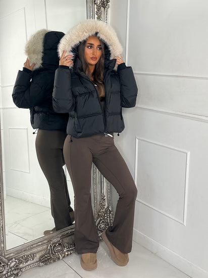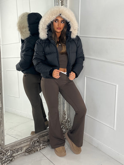 Cropped Faux Fur Trim Padded Jacket - Black/Cream