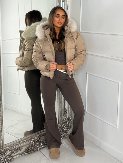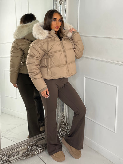 Cropped Faux Fur Trim Padded Jacket - Taupe/Cream