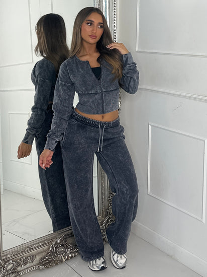 Cropped Zip Up Acid Wash Tracksuit - Charcoal Grey