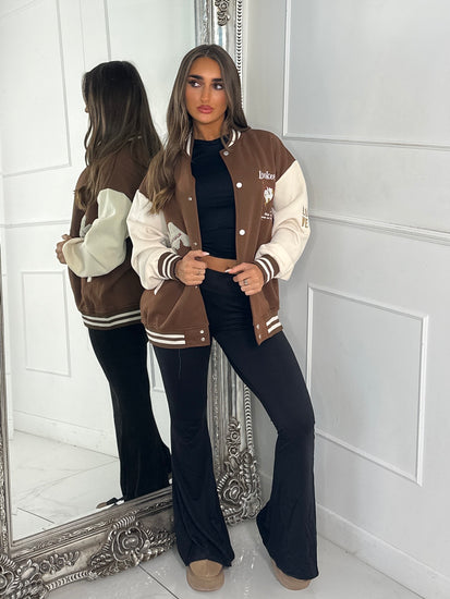 Embroidered Teddy Detail Varsity Jacket - Brown/Cream