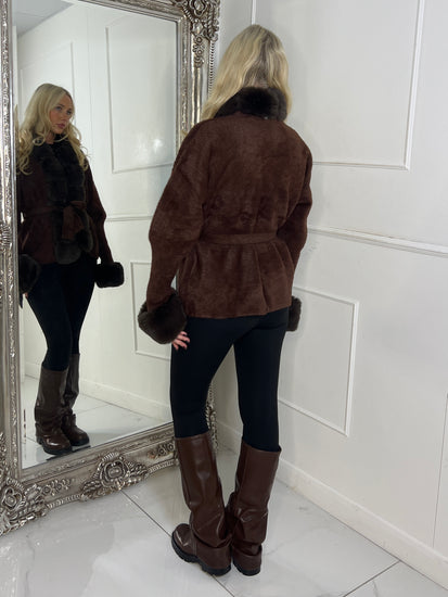 Faux Fur Trim Tie Belt Cardigan - Brown