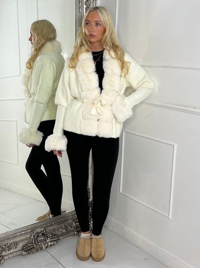 Faux Fur Trim Tie Belt Cardigan - Cream