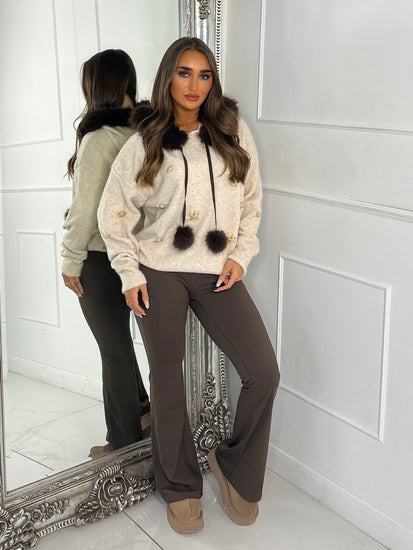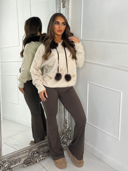 Fur Hooded Pom Pom Gold Jewelled Detail Jumper - Beige/Brown