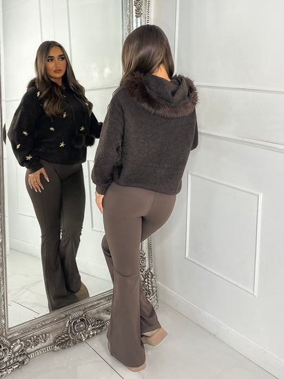 Fur Hooded Pom Pom Gold Jewelled Detail Jumper - Brown