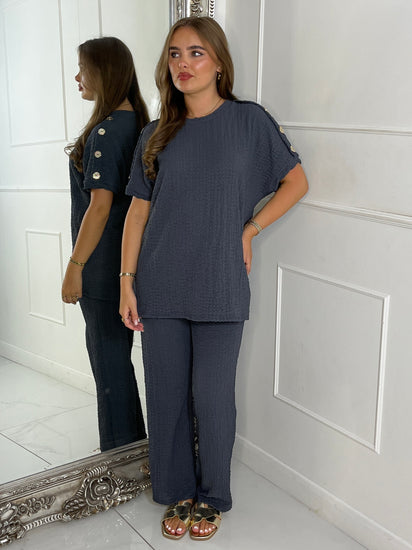 Gold Button Detail Oversized Top & Wide Leg Pants Co-Ord - Charcoal Grey