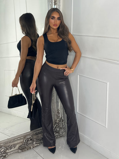 High Waisted PU Leather Look Flares - Chocolate Brown