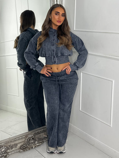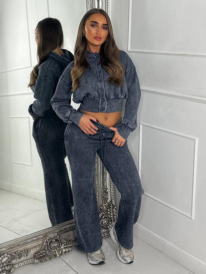 Hooded Button Up Cropped Acidwash Tracksuit - Charcoal