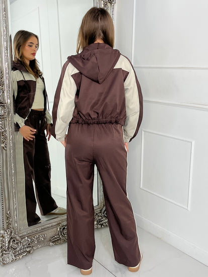 Hooded Colour block Jacket & Straight Leg Pants Set - Chocolate/Beige