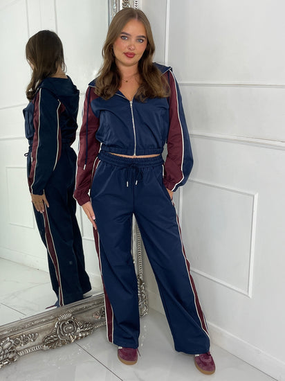 Get ready to slay in style with our Hooded Colour block Jacket & Straight Leg Pants Set! Made with the perfect combination of wine and navy colors, this set is both trendy and comfortable. Perfect for any occasion, it's the ultimate addition to your wardrobe!