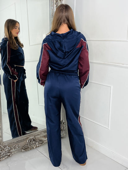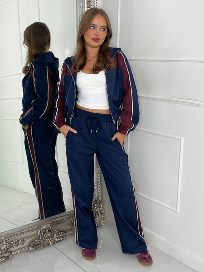 Hooded Colour block Jacket & Straight Leg Pants Set - Wine/Navy