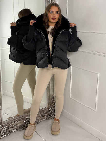 Hooded Puffer Coat With Faux Fur Trim - Black