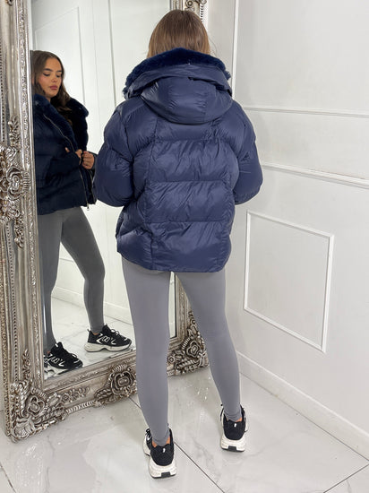 Hooded Puffer Coat With Faux Fur Trim - Navy Blue