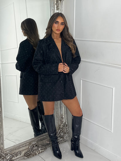 Lace Diamante Detail Oversized Blazer Dress - Black