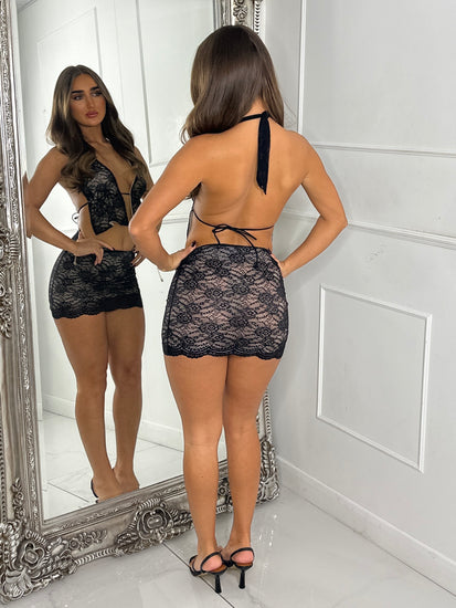 PRE ORDER Lace Mini Skirt & Halterneck Top Co-ord - Black/Beige