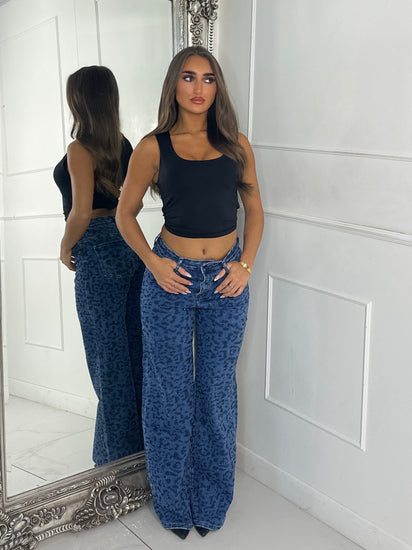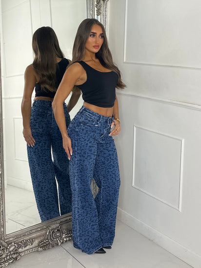 Leopard Diamante Detail Wide Leg Super Stretch Jeans - Denim Blue