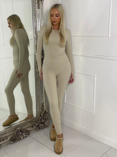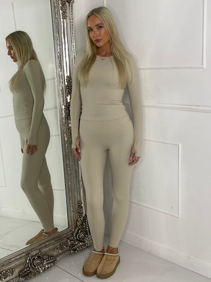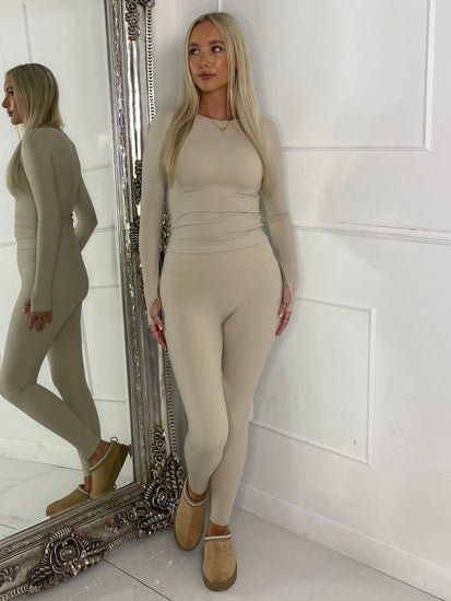 Long Sleeve Gym Top & Sculpt Leggings Set - Beige
