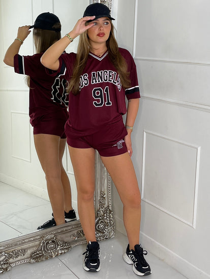 Los Angeles Varsity Top & Matching Shorts Co-ord - Wine / Black & White