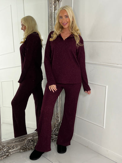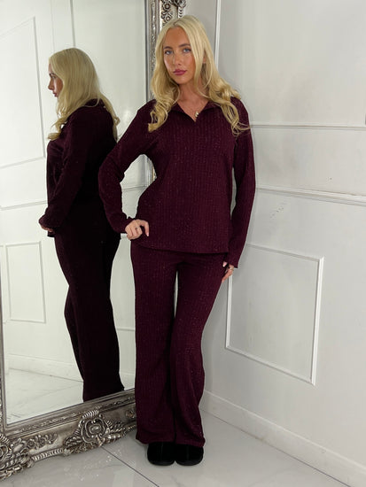 Lurex Glitter Oversized Shirt & Wide Leg Pants Co-Ord - Wine