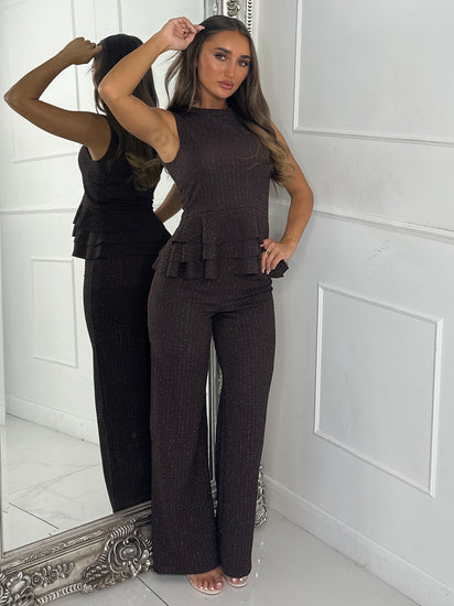 Lurex Knit High Neck Ruffle Top & Flares Co-Ord - Chocolate
