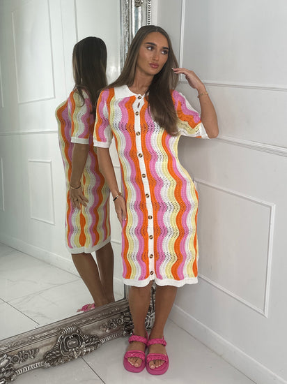 Brighten up your wardrobe with our Multi Coloured Collar Detail Crochet Dress in shades of White, pink, and Yellow. This playful dress features a unique collar detail, adding a touch of fun and quirkiness to any outfit. Perfect for those who like to stand out and embrace their playful side!