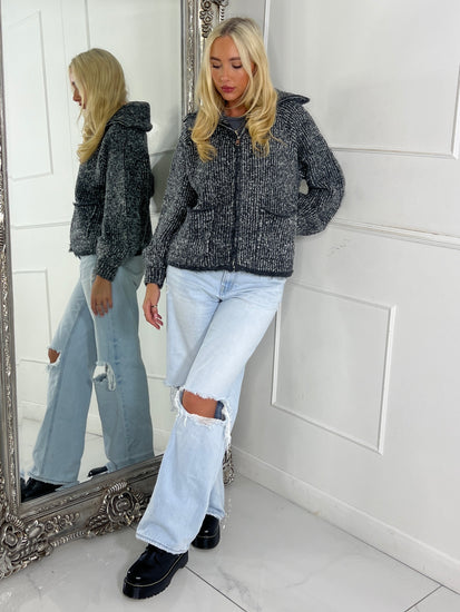 Oversized Collar Pocket Detail Knitted Zip Up Jumper - Grey