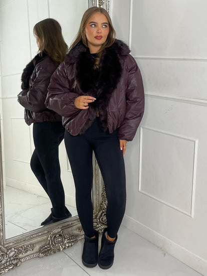 Wrap yourself in cozy charm with this PU Faux Fur Collared Bomber Jacket in rich wine. Its soft faux fur collar adds warmth and a touch of luxe, while the sleek bomber design keeps you effortlessly stylish. Perfect for turning heads on chilly days, this jacket brings playful sophistication to your wardrobe with every wear.