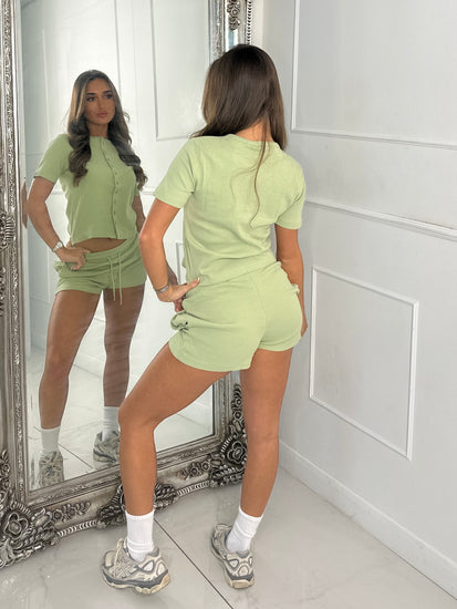 Round Neck Button Up Ribbed Top & Drawstring Shorts Co-ord - Sage Green