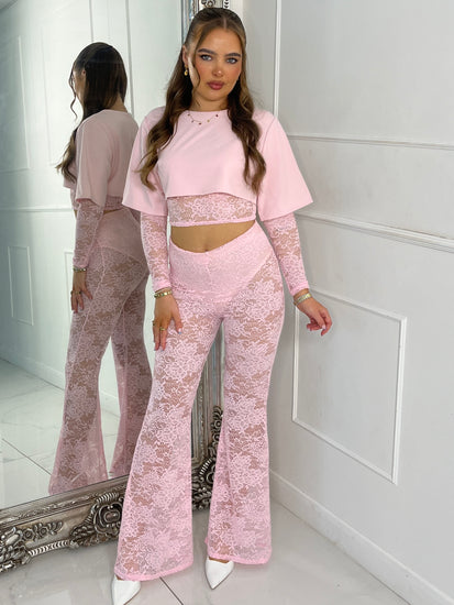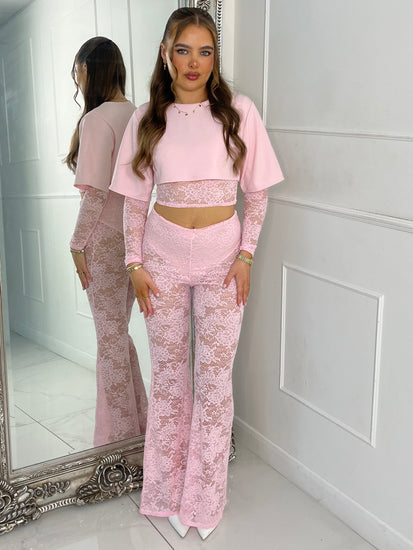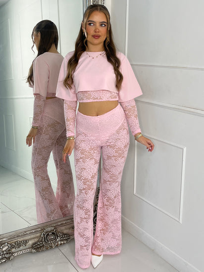 Round Neck Lace Underlayer Long Sleeved Cropped Top & Built In Pink Knicker Underlayer Lace Flares Co-Ord - Baby Pink