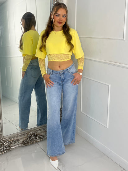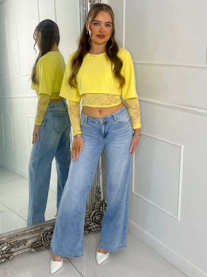 Round Neck Lace Underlayer Long Sleeved Cropped Top - Yellow