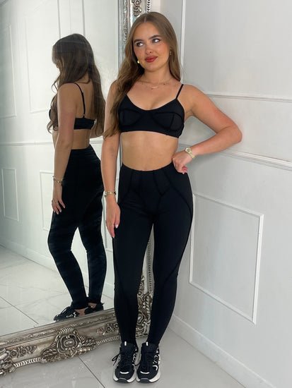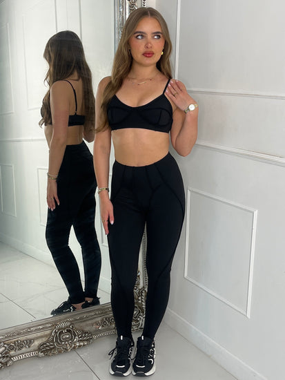 Elevate your workout wardrobe with this sleek black set! The seam details add a touch of style to both the sports bra and leggings, while providing the support you need for squats, sprints, or stretches. Perfect for turning heads at the gym or lounging at home – because who says fitness can't be fun and fashionable? Sweat in style!