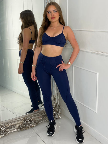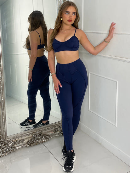 Elevate your workout wardrobe with this sleek navy set! The seam details add a touch of style to both the sports bra and leggings, while providing the support you need for squats, sprints, or stretches. Perfect for turning heads at the gym or lounging at home – because who says fitness can't be fun and fashionable? Sweat in style!
