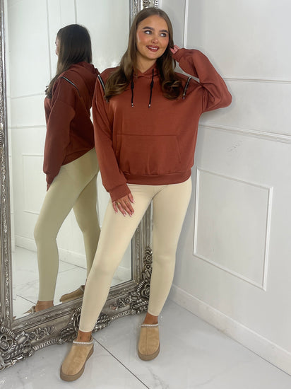 Shoulder Zip Detail Lightweight Hoodie - Rust