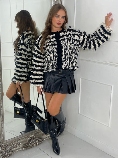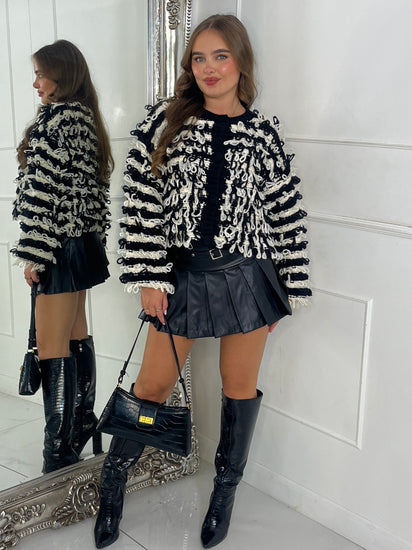 Soft Fluffy Loop Detail Cardigan - Black/Cream Mixed