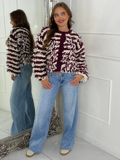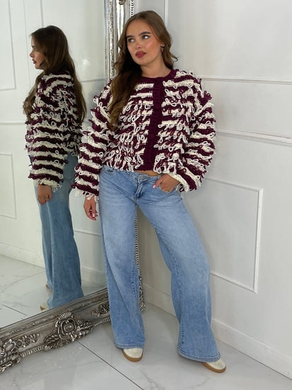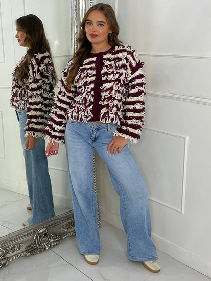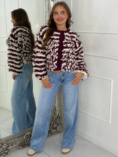 Soft Fluffy Loop Detail Cardigan - Wine/Cream Mixed