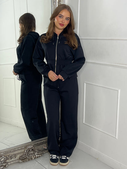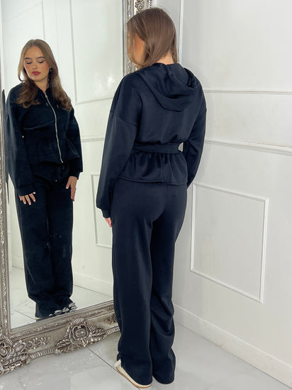 Straight Leg Trousers & Sinch Waist Detail Hoodie Co Ord - Black