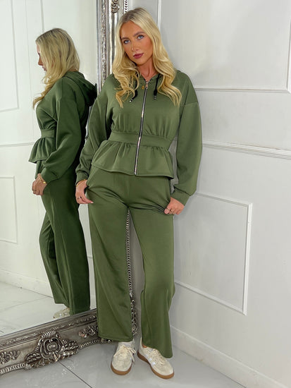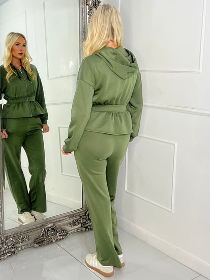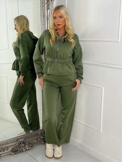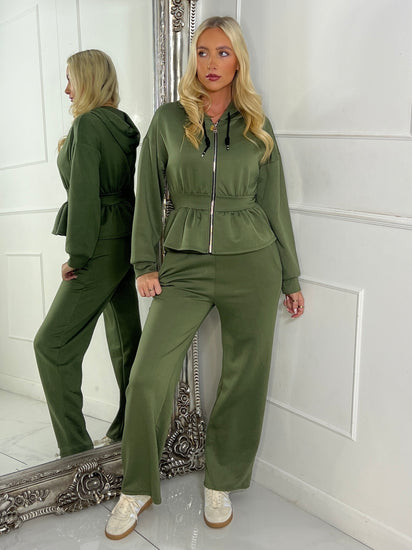 Straight Leg Trousers & Sinch Waist Detail Hoodie Co Ord - Khaki
