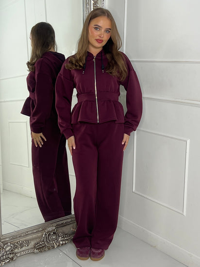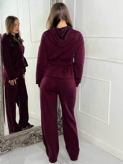 Straight Leg Trousers & Sinch Waist Detail Hoodie Co Ord - Wine