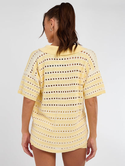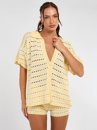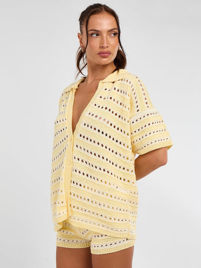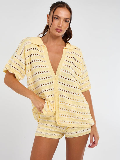 Stripe Crochet Knitted Shirt & Shorts Set - Lemon Yellow