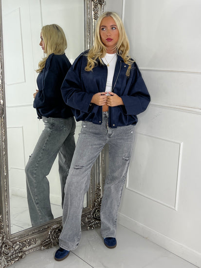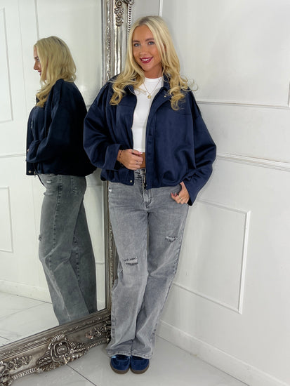 Suede Collared Oversized Bomber Jacket - Navy
