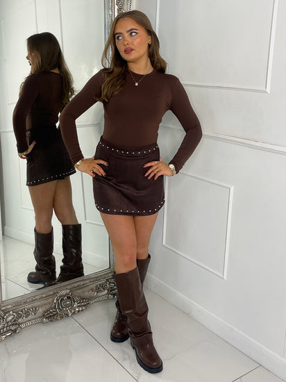 Elevate your game with this cheeky suede skort that's part skirt, part shorts—the ultimate style shortcut for anyone who refuses to choose. Studded details add an edgy twist to a timeless silhouette, while the suede fabric keeps things luxe and touchably soft.