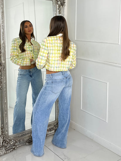 Elevate your style game with this sassy tweed cropped bomber jacket! Featuring eye-catching gold buttons and a playful multi-colored pattern, it's the perfect statement piece for turning heads. Who said fashion can't be fun?