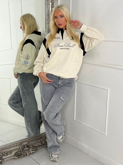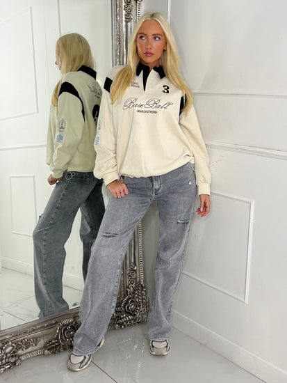 Varsity Slogan Detail Rugby Style Top - Cream/Multi