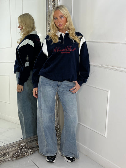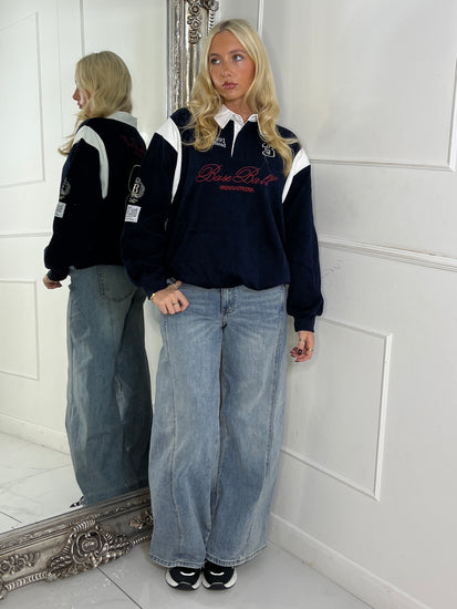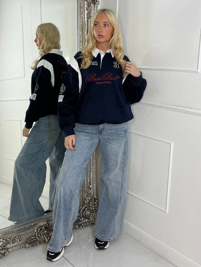 Varsity Slogan Detail Rugby Style Top - Navy/Multi