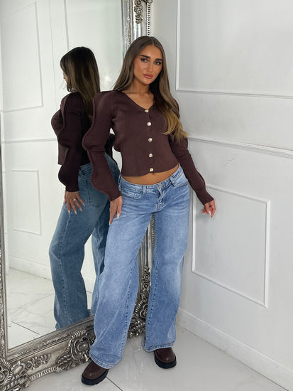 Get ready to make a statement with our Wavy Arm Gold Button Cardigan! This unique brown cardigan features wavy arm detailing and shimmering gold buttons. Perfect for adding a touch of quirkiness to any outfit. Say goodbye to boring cardigans and hello to fun fashion!